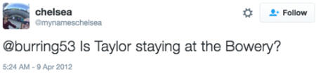 8 de abril de 2012 taylor va a visitar a dianna al hotel bowery
